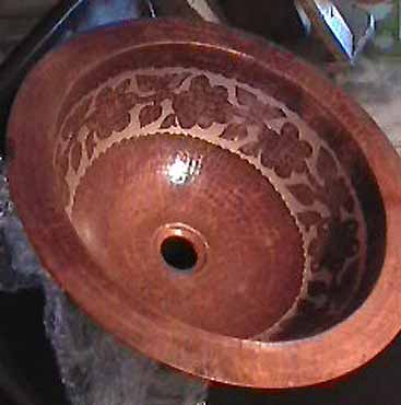 COPPER SINK, ROUND silver inlay Dimensions: Finish: silver etch, copper tone, hand hammered Code: 106700002